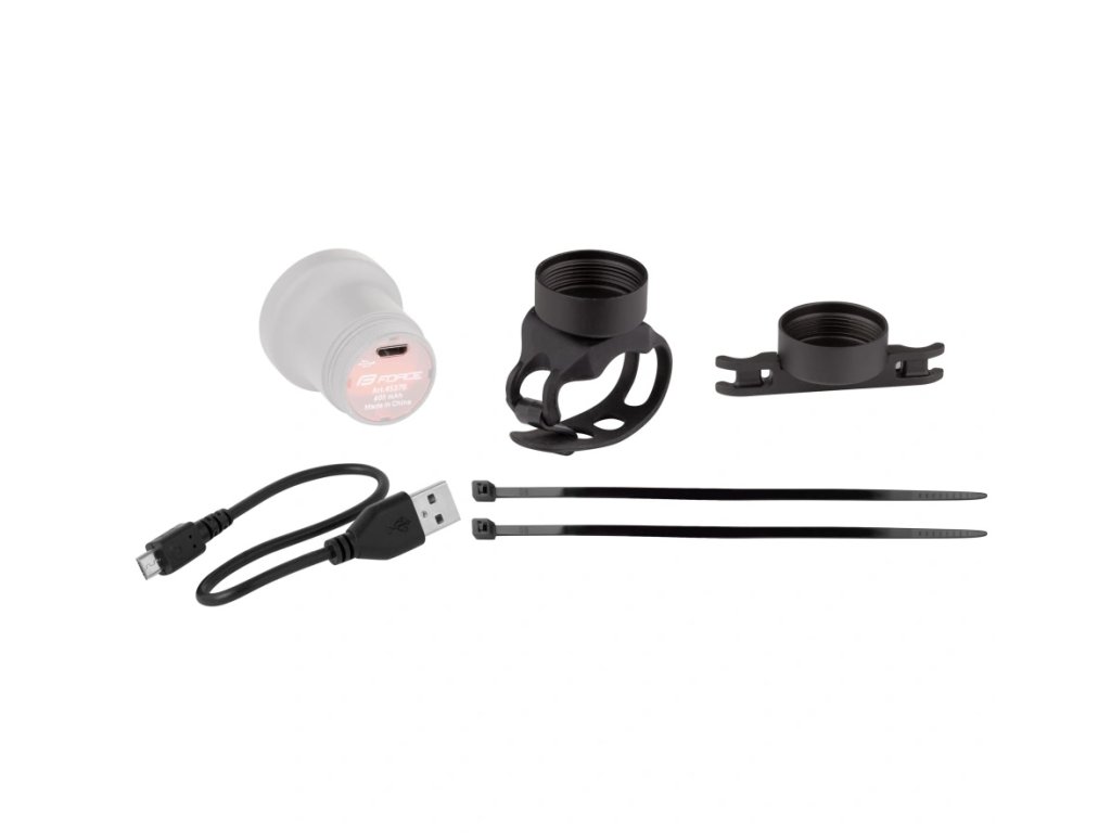 Součástí balení je držák na sedlovku, na sedlo a dobíjecí USB kabel.