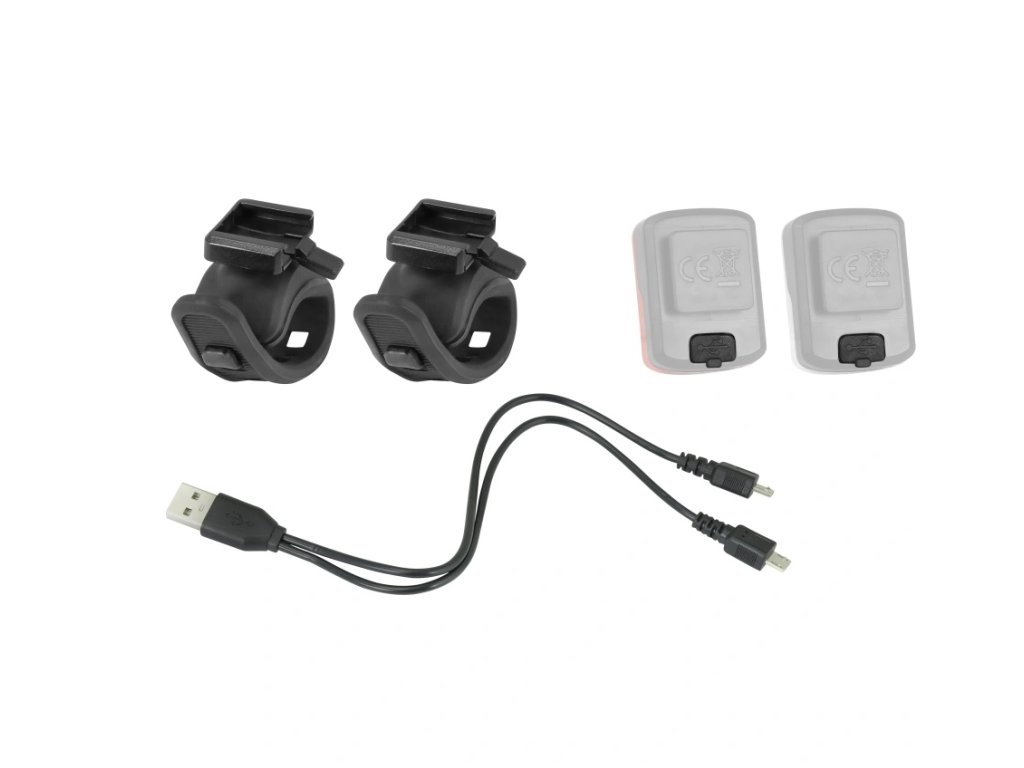 polohy. Součástí balení jsou držáky na řídítka, sedlovku a dobíjecí USB kabel.