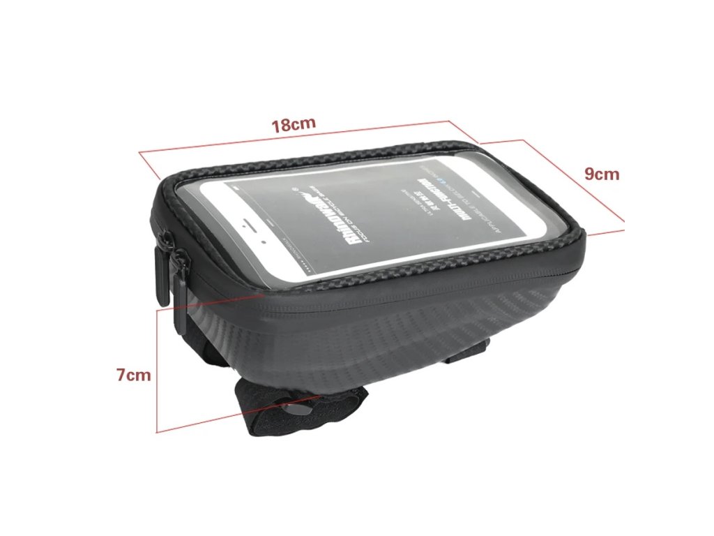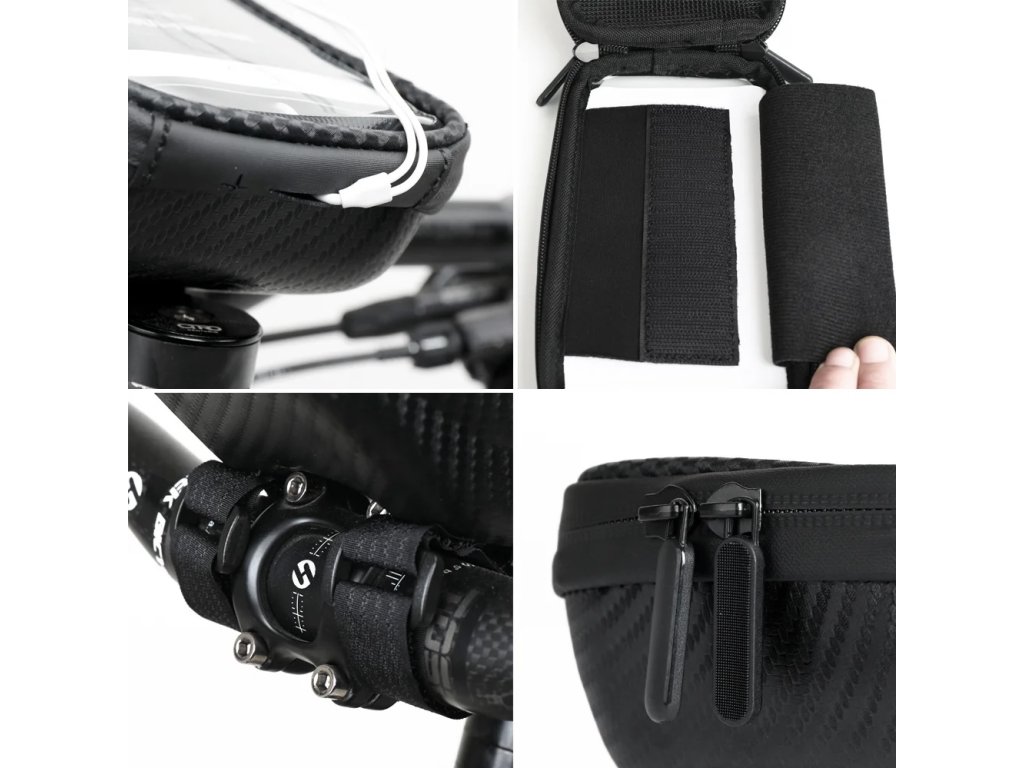 Tato brašna na mobilní telefon je určená k uchycení na řídítka pomocí tří pásků se suchým zipem. Spodní část brašny je vyrobená z pevného pružného materiálu. Vrchní část je z průhledného materiálu s vysokou citlivostí k ovládání mobilního telefonu. Celá brašna včetně zipu je odolná proti vodě. Díky tomu je telefon chráněný před vlhkem a prachem. Brašna má otvor pro vyvedení kabelu ke sluchátkám. Vhodná je pro telefony o uhlopříčce až 6,5". Do pouzdra lze kromě telefonu uložit další věci.