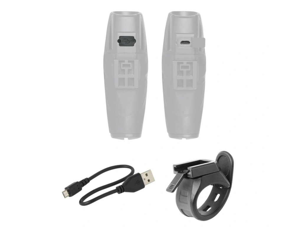 Součástí balení je držák na řídítka a dobíjecí USB kabel.